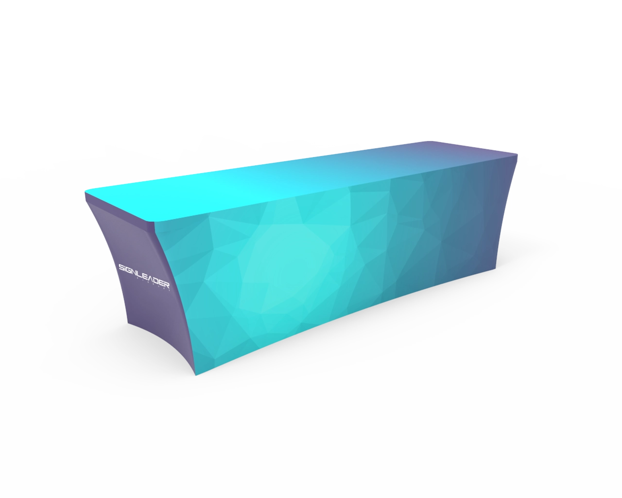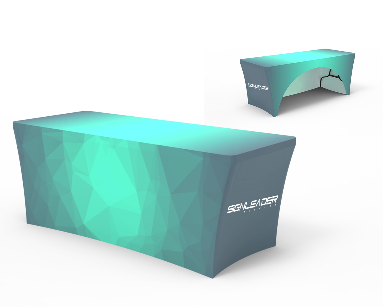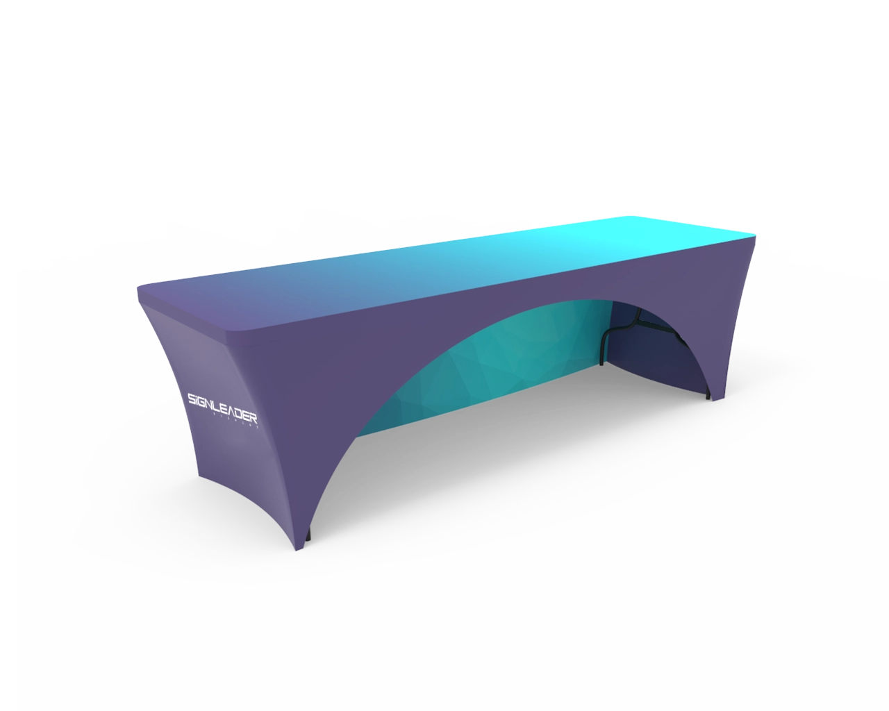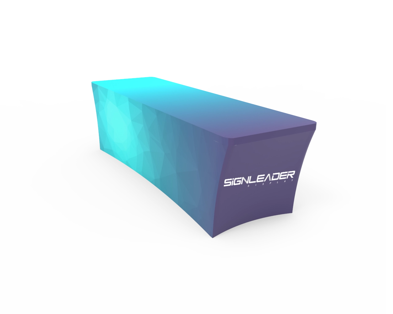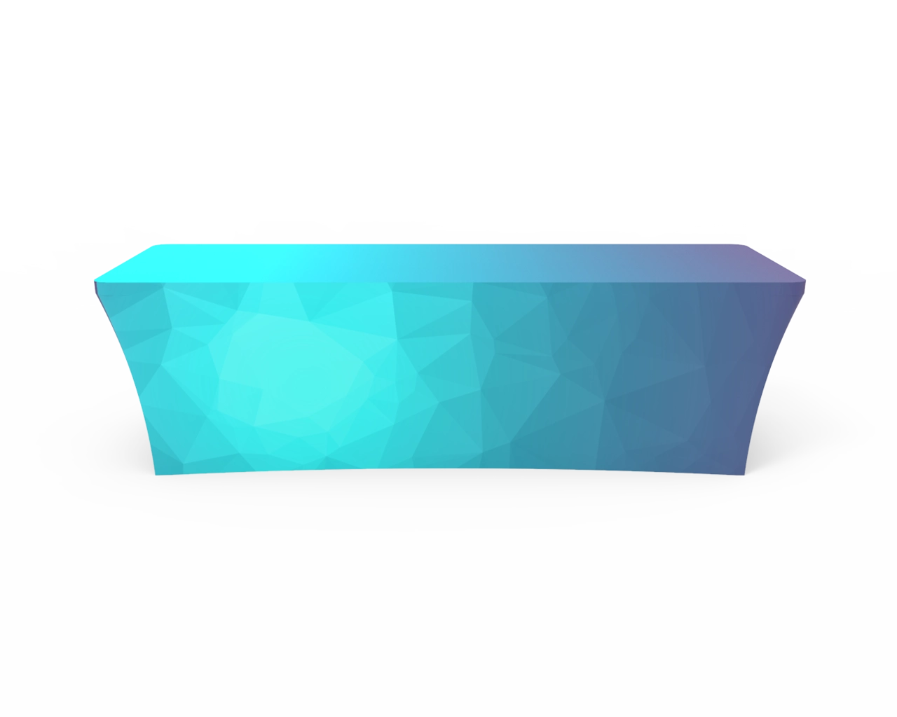 This stretch table cover option is 3-sided, fully covering the front and sides of the table with the backside open for under table storage. The Stretch Table cover fits most 6' and 8' collapsible tables, perfect for a variety of tradeshows and events. The table cover is a fully customizable dye-sub graphic print. Canvas loops included securing the cover to each leg during install.