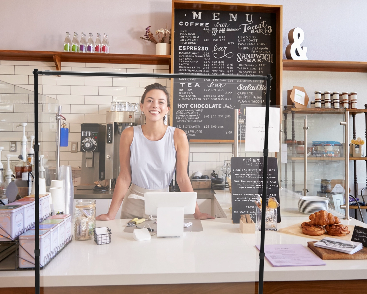 The sneeze guards for sale protection kits include an adjustable aluminum tube frame with a buckle and a 0.3mm thick soft PVC 450 GSM (+/- 10 GSM). The clear PVC panel can be fixed on the bracket. These multifunctional devices are very easy to install. Complete sneeze guards help prevent the spread of the coronavirus. The visual representation of additional safety precautions can also remind you to use correct hygiene habits. The effective sneeze shields are high and wide sneeze protection devices. You can choose the best sneeze partition Walls protection solution of Signleader Display’s kits of different sizes. Rugged and durable adjustable aluminum tube bracket and PVC transparent board, professional and beautiful appearance design, US delivery, fast turnover, free shipping, order now!