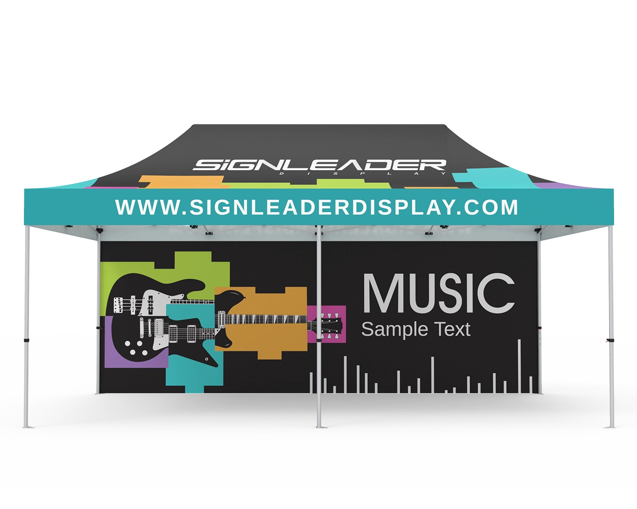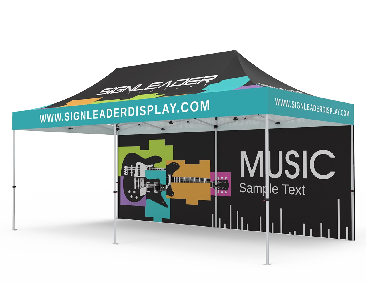 Signleader offers 10x20 pop up custom tents with vivid and bright graphic printing, hexagonal aluminum, and easy to set up pop up frame. High-resolution & full-color graphic printing makes your tent logo graphics come alive, which is the best way to help you showcase your products in various events. The canopy is made of 600 denier polyester fiber, which provides all-weather flexibility and long-lasting durability.