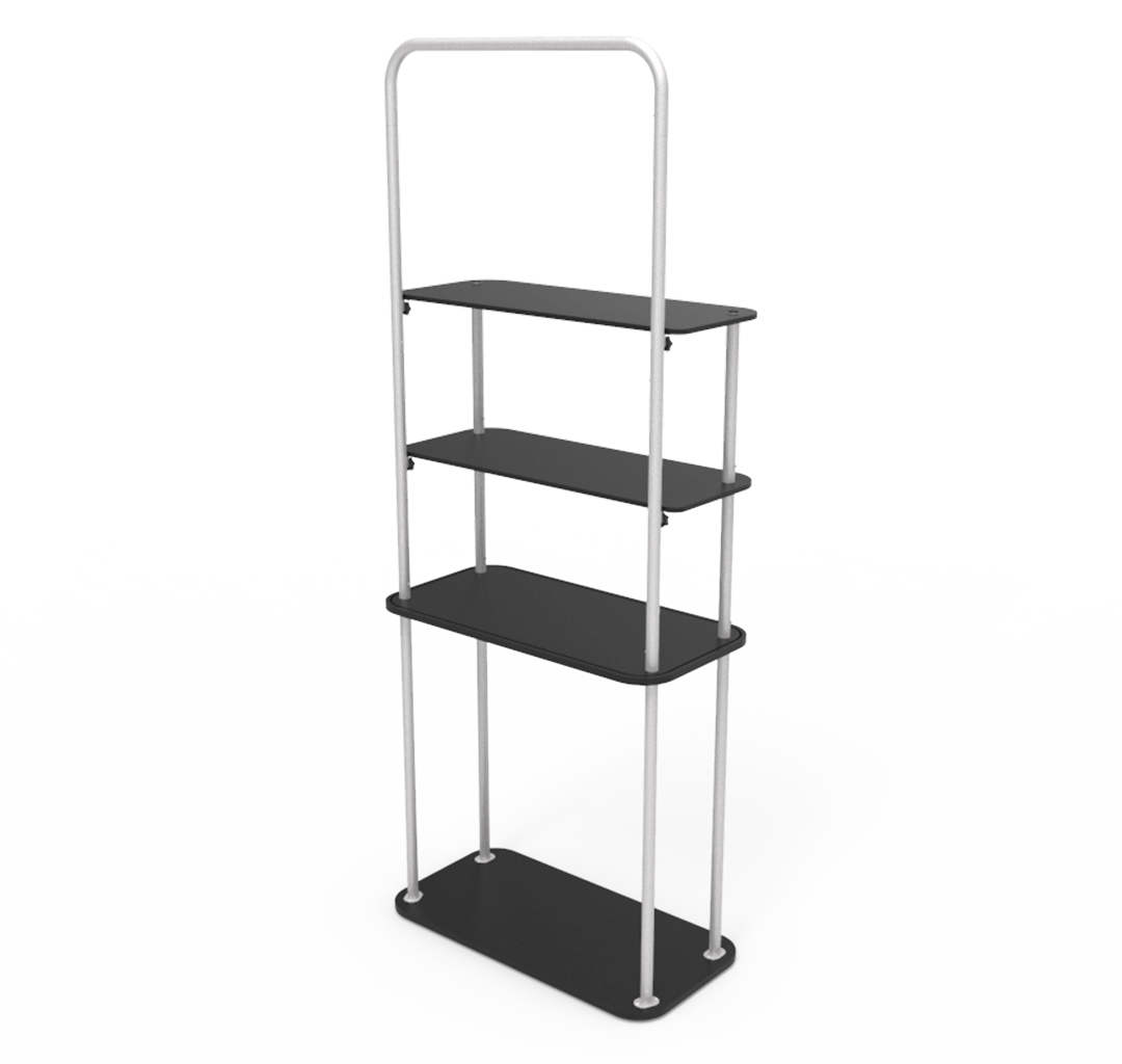 Firstly, the display shelf graphics can be attached in a matter of a few seconds to create a unique look that is both informative and visually appealing. Secondly, the display shelf frame is modular and set on collapsible aluminum snap-tube frame and medium density fiberboards which is lightweight, attention-grabbing, easy to assemble without the use of tools, and easy carrying. Thirdly, the display shelf features 3 shelves to display your products and save the space.